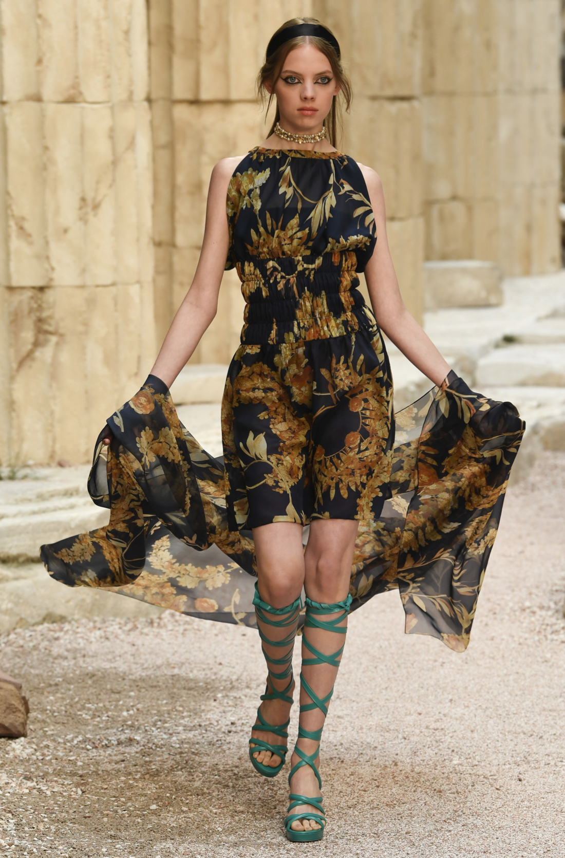 CHANEL 18C Greece Printed Silk Dress Navy/Gold 34
